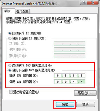 选择 [使用下面的DNS服务器地址],输入 [首选 DNS服务器为 8.8.8.8 ]和 [备用DNS服务器为8.8.4.4],然后点击 [确定]。